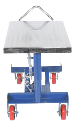 Hydraulic post tables are ideal in material handling facilities. The unit can be of use in a variety of environments from lifting dies and castings to moving machine parts. The corner posts are telescoping to help stabilize and fully support the load during operation. The tables roll smoothly on two (2) locking swivel casters with brakes and two (2) rigid. The tables can be lifted/lowered with a single speed foot pump, two-speed foot pump, two speed auto shifter that automatically shifts when the table is loaded, or linear actuated power.