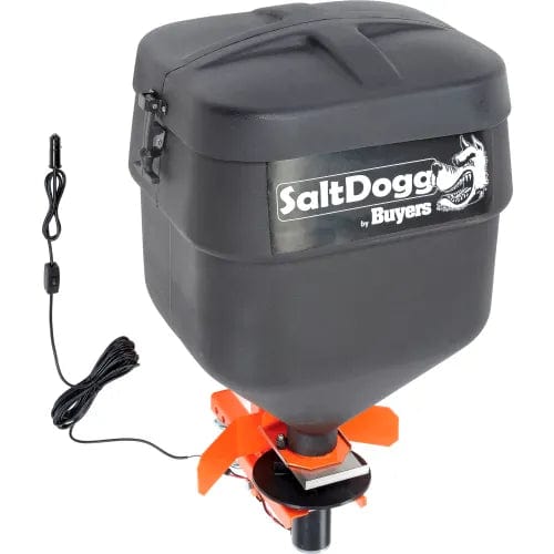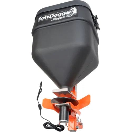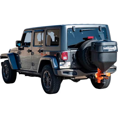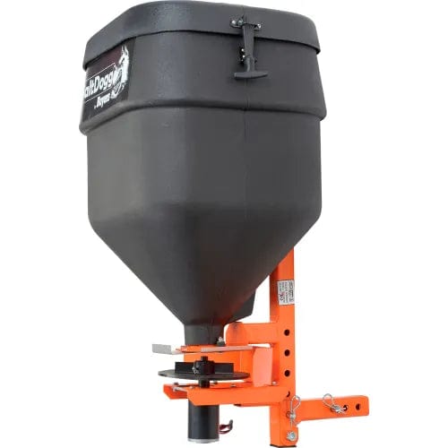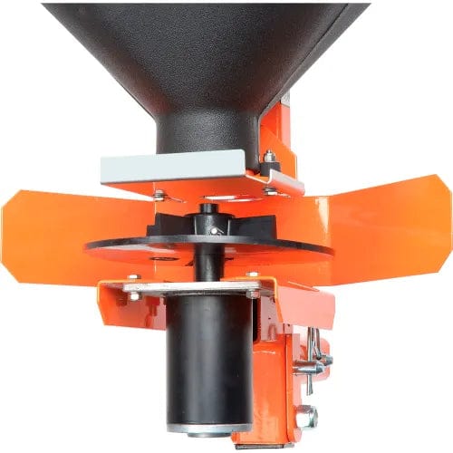 This SUV tailgate spreader features a "fold-away" design, allowing you to simply release the hitch pin to fold it out of the way for easy access to the rear door or tailgate. Rugged black thermoplastic hopper with an orange powder coated steel frame is attractive and built for years of service. Ultra-smooth hopper interior allows material to flow through the gate to the hopper throat and 9" poly spinner, providing an even flow of material without the need of an expensive auger add-ons or vibration kits. Gravity feed SUV salt spreader accommodates use of #1 rock salt or similar free-flowing material.