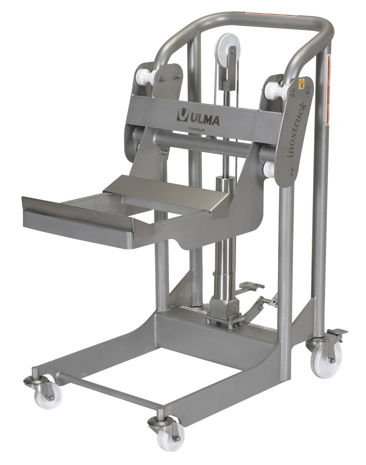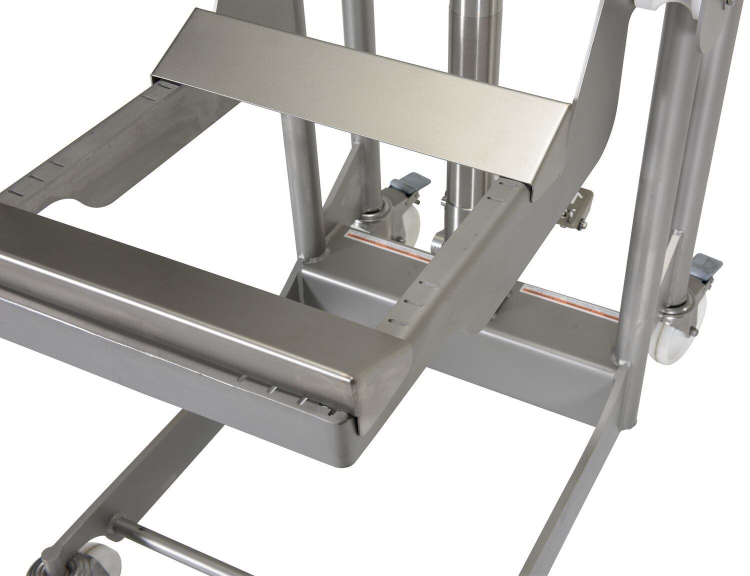 A Stainless Steel Hydraulic Foot pump roll handler is great for an assortment of areas including the food handling service industries. The 304L stainless steel construction, including hydraulic cylinders and piston the design is sleek, smooth, and easily washable for before and after use in hygienic areas. The raising and lowering of the platform to the precise position is made easy by the hydraulic foot pump design, which diminishes needless bending when loading/unloading material. A rounded handle style allows for a proper two handed grip when maneuvering around work areas, while the perfect open cradle platform lets the user load material from three sides. Cradle adjusts in 1" increments up to 16" wide. The handler rolls smoothly on four swivel casters with two attached rear brakes for safe functionality when in a resting position.