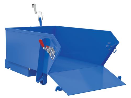This self-dumping steel Hopper has a low-profile design with a drop-down front for easy shovel loading. The manual hand latches are used to secure the drop-down front. The manual pull-cable is used to dump the hopper from the seat of a fork truck, the dumper returns to the upright position when lowered to the ground.
