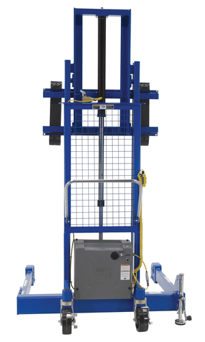 The pallet master/server enables one person to easily move fully loaded pallets without the use of a fork truck. The unique straddle design works well with pallets and skids with and without an understructure. The unit is ideal for loading and unloading semi-trailers. Hand pendant control on an eight (8) foot coil cord standard. Floor lock standard. All welded steel construction.