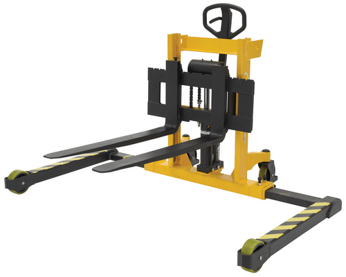 Manual Hydraulic hand pump stackers are sturdy and compact to fit through standard height doors. Forks are raised by manual hydraulic hand pump operation and released by a lever situated on the handle. 1" lift per handle pump. Two rigid and two swivel wheels standard.